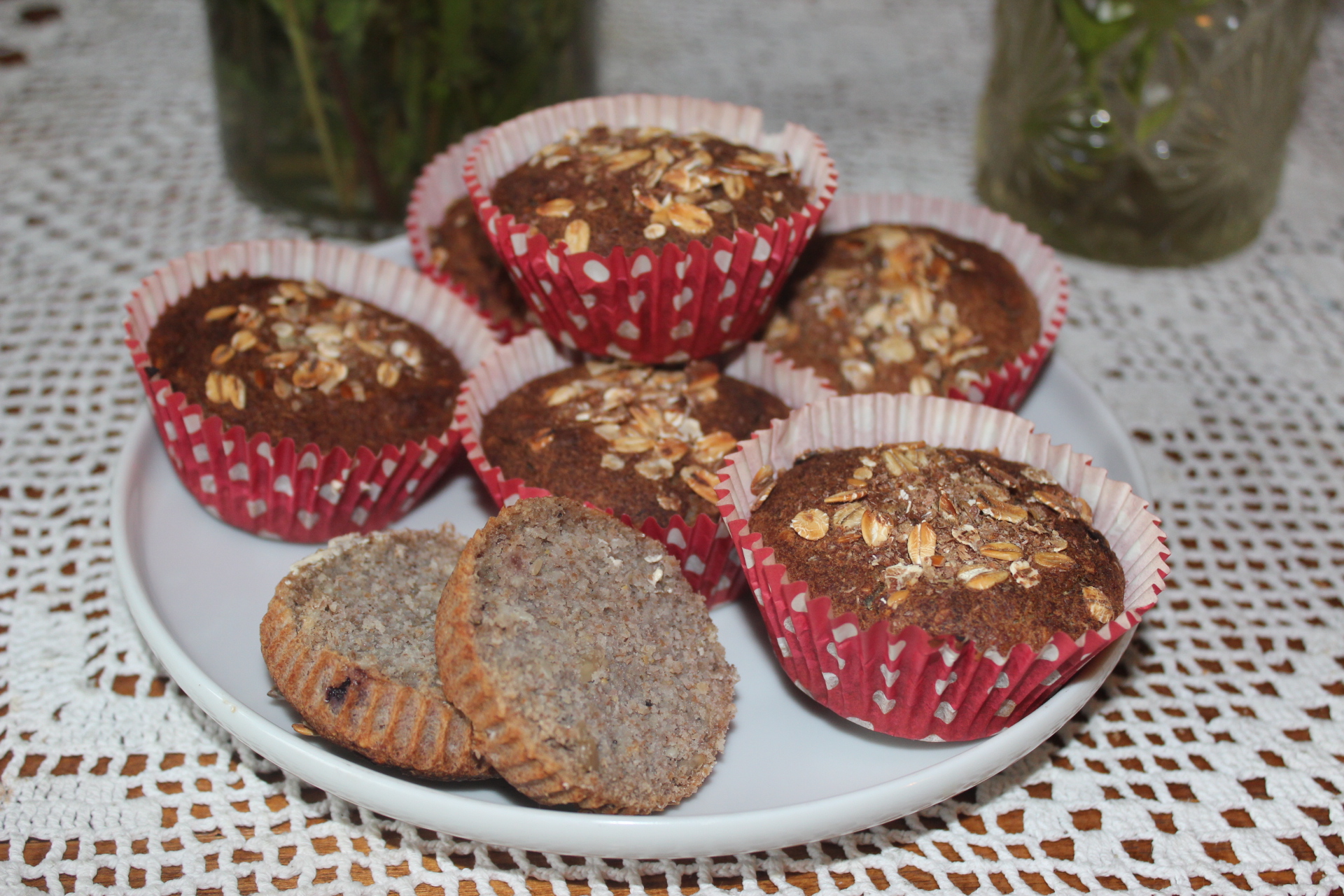 Recept: Havregryn 60 %, rismjöl 35 %, mandelmjöl 5 %, 2 ägg, 2 msk olja, 2 msk svartavinbärssylt, lite solrosfrön, sesamfrön, russin och vatten och som dekoration på ytan lite havregryn. Jag gillar att använda muffinsformar, för att i vanliga formar brukar mina degar bli rå, men in små formar gräddas degen helt igenom och bröden blir söta och små.