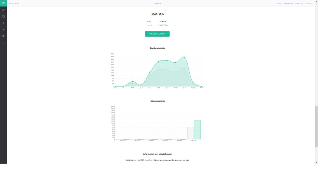 Hur var detta i detalj? Jag gick med i Stylewish miljö och jag blev godkänd (blev antagen till systemet, ett konto öppnades). Jag fick börja göra moodboarder eller collage med varumärkets produkter med länkar till deras nätbutiker. De collage som blir färdiga får du sedan flytta som kod i din egen webb. Jag gjorde många utskick på fyra språk med många reklamlänkar och delade artiklarna även i mina sociala medier. Dessutom gjorde jag några reklambanners för varumärket. För varje unik val, som mina läsare gjorde i nätbutiken genom Stylewish länk, skulle jag få ett visst pris. Betalningen lovade Ekerling sedan när det kommit upp till 300 SEK. I mina webbportaler fylldes det i ett par dagar, men en del bloggare gör reklam för varorna i nästa ett halvår för att få ihop antalet för unika besökare. Jag gick med den 2 april, den 10 april skulle vara lönedag. Till dess hade mina läsare gjort 9 304 klickar på olika reklamlänkar. Ekerling lät mig hela den tiden göra reklam för varumärken i lugn och ro och blandade sig inte på något sätt, men när det var dags att betala, började han rabbla upp fel. För att jag var ny i systemet, skrev jag den 11:e dagen ett brev till Ekerling och frågade, hur fortsättningen skulle fungera, skulle jag skicka räkning till dem eller betalade de själva till sina medarbetade enligt systemets öppna statistik. Stylewishs system räknar ihop klickar på alla olika länkar och varumärken.