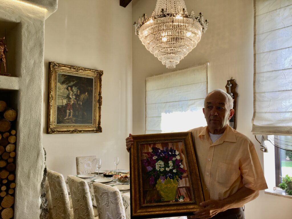 Som gåva gav jag min far en målning jag gjorde 2019 som heter “Sweden´s National Day“, som också visades på utställningen på Estlands nationalmuseum. Det är mitt livs andra blomstermålning, min första blomstermålning “Syringa vulgaris” var en gåva till min mor. Jag bakade också en hallontårta och vi gav också ett mycket vackert fågelbord i trä i present. Min far är en stor fågelälskare och varje vinter hänger han upp talgbollar och fröhus i trädgården och sedan tittar han ut genom fönstret vid sitt skrivbord och ser fåglarnas sysslor i trädgården. Trevligt!