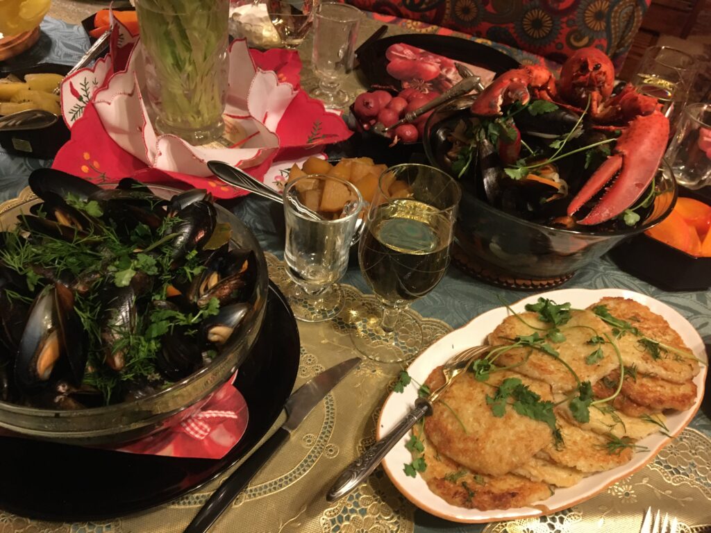 Hummer; läckra blåmusslor i en speciell, kryddig vinsås med örter; räkor smaksatta med koriander, dill och peppar; härlig rökt ål; rom med läckra potatiskotletter (Latkes) serverade med gräddfil och lök; lätt soppa med skaldjur osv. Dessutom sallader (potatis-salladsblad-sallad, pumpasallad, körsbärsäpplen osv.) för gäster som inte älskar skaldjur. My-oh-my !! Så super!