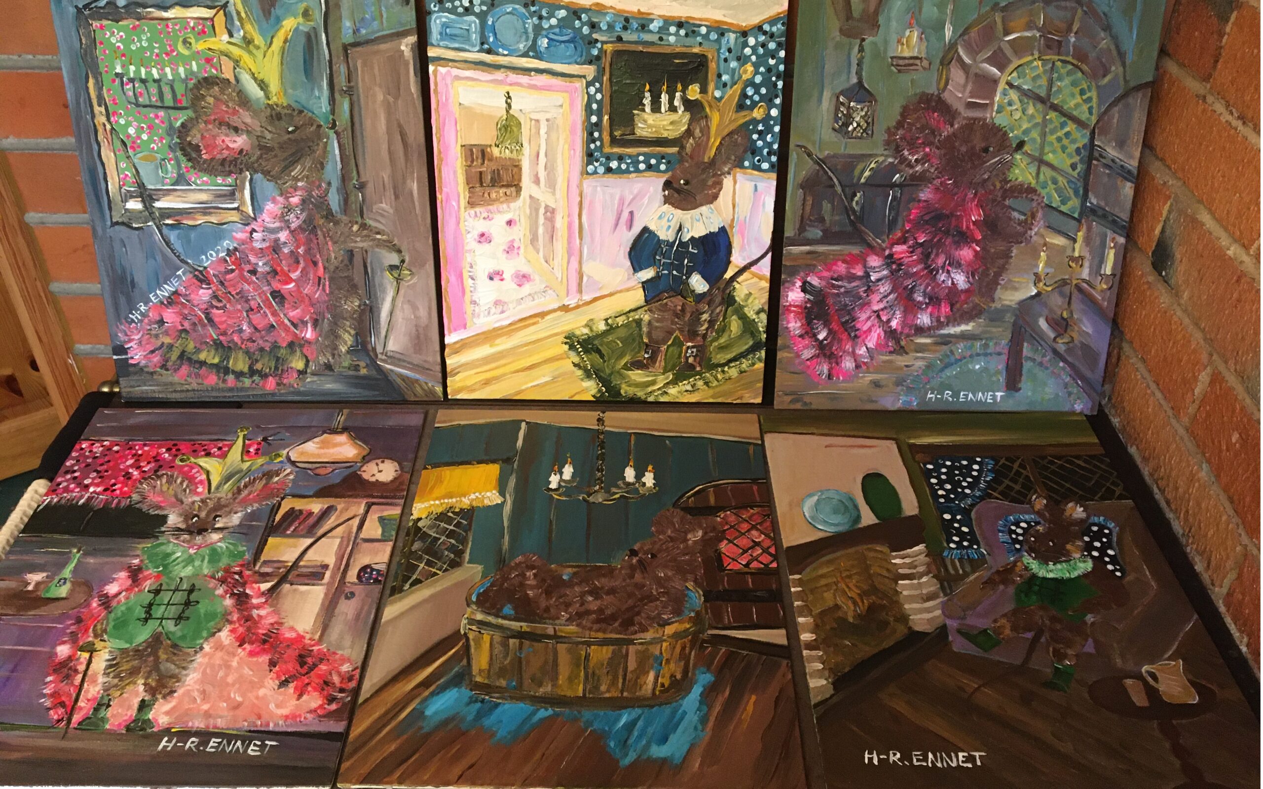 I våras deltog jag i en tävling ordnad av Estlands nationalmuseum (ERM) och i mitten av september fick jag veta att vår idé “Häxköket i vårt hem” vann Estlands nationalmuseums idétävling ”Min egen utställning”, och nu får vi ordna vår egen utställning i ERM: s deltagarhall (130m2!). Segern orsakade en flod av inspiration hos mig, och den första idén som resultat av detta var “Hans Höghet Musen den Förste”. Först var tanken att göra 12 musmålningar i sagovärldsstil och skapa en liten “barnvärld” jämte den – att göra en sagobok med stora bokstäver för de små. Under arbetets gång har idén och ambitionen vuxit – istället för att måla en serie på 12 mustavlor skulle jag vilja göra minst 36 målningar eftersom jag tyckte att en barnbok med 12 bilder kunde bli för tunn och “blek”. För närvarande finns sju vertikala akrylmålningar (mått 30x40cm) redo och en saga håller på att slutföras. Först signerade jag målningarna, men sedan tänkte jag att jag i fortsättningen skulle skanna målningarna till en dator och först därefter signera dem, för jag vill inte ha mitt namn på varje bild i barnboken. De första målningarna måste skannas till datorn och med hjälp av Photoshop ta bort signeringarna.