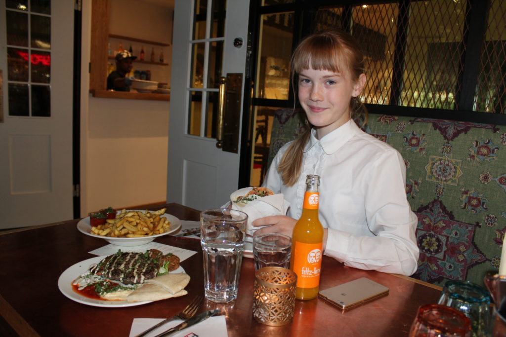 Jag tog Kebab Meze sallad (recept: tabbouleh, hummus, matbukhta, tzatziki, aubergine, tahini, falafel, tomat, gurka, salladsblad, rucola, persilja, olivolja, citronsaft och pita) – pris 9,90 €, Estella Elisheva tog FAFA’s kyckling (ingredienser: tzatziki, matbukha, aubergine, tomat, gurka, tabbouleh, sallad, persilja, pita) – pris 8,90 €, och sedan tog vi pommes med matbukha 2 €, vatten 2 € och läsk 4 €. Portionerna var mycket stora och så goda!!! Mmmmmmmm…….