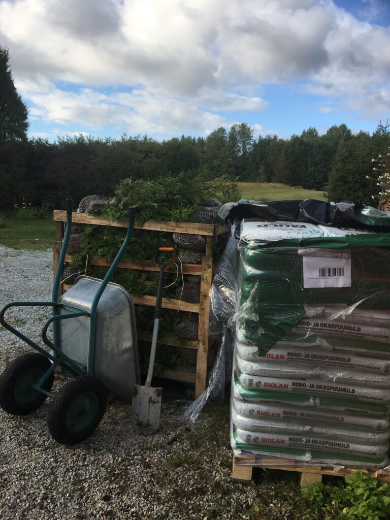 Jag beställde också över hundra tujor (100 Brabant och 8 Smaragd sorter) från Hortese och planterade dem bredvid staketet som ersättning för de syrener som röjdes bort. Fy, vad den där trädgården sväljer plantor! Enbart tujaplantor har jag redan köpt över 400 för trädgården. Jag beställde också lite mull (både tipplass och i säckar med mull för rhododendron och barrträd) och grus från Isekallur.ee.