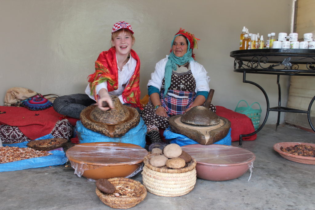 Kanske några av er har sett en exotisk syn – getter som äter i trädtoppar som fåglar. Djur som klättrat högt upp roffar åt sig saftiga frukter från arganträd men fröna som finns inom ett hårt skal klarar inte deras matsmältningsorgan att ta hand om. Således samlar kvinnor nötter från kreaturens spillning, och sedan börjar en relativt arbetsam hantering. Traditionellt pressar man oljan för hand (från ca 36 kg får man en liter ren olja) och därför är denna olja unik.