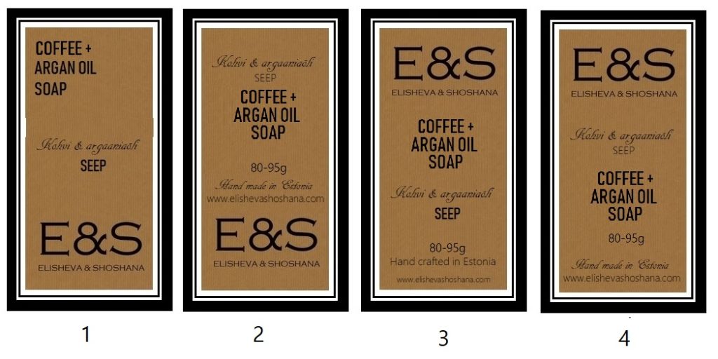 Men en stor del av processen av E&S produkten är utseendet – logo har vi haft i bruk sedan flera år, men etiketterna till flaskor, burkar, askar är först nu under planering och det är en viktig del av arbetsprocessen – jag vill nämligen att allting ser vackert ut och att de skulle representera våra produkter med värdighet. Därför är det viktigt med rätt typ av förpackningar och rätt design. Jag skulle vilja använda enbart återvunnet material i förpackningar – kartong, PET-material osv. Igår designade jag etikettmallen till vår Kaffe-Arganoljatvål… vad tycker ni, vad är den bästa lösningen – vad skulle man lägga till/ta bort/ändra? Jag skapar förpackningarna färdigt helt själv (jag är verkligen excited i hela processen!!) och sedan skickar jag de färdiga idéerna och modellerna till konstnären och tryckeriet. Om någon har bra idéer om hur och vad man skulle kunna göra, vilken typ av förpackning ni gillar och vilken slags packade produkter ni föredrar – skriv till mig! För varje bra idé eller användbar tips som genomförs belönas med en vacker och värdefull SPA presentförpackning!